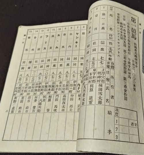 三津浜競馬場の1929(昭和4)年秋季開催3日分の番組表。3日目の第7レース以降は、初日二日目の結果を受けての優勝戦で、枠だけあって空欄。3日目メインの11レース、内国産駆歩甲種優勝競走は、「第一、二日甲組各競走ノ第一、第二着馬ノタメニ設ク」とありハンデキャップで距離2,200m、1着賞金は330円。
